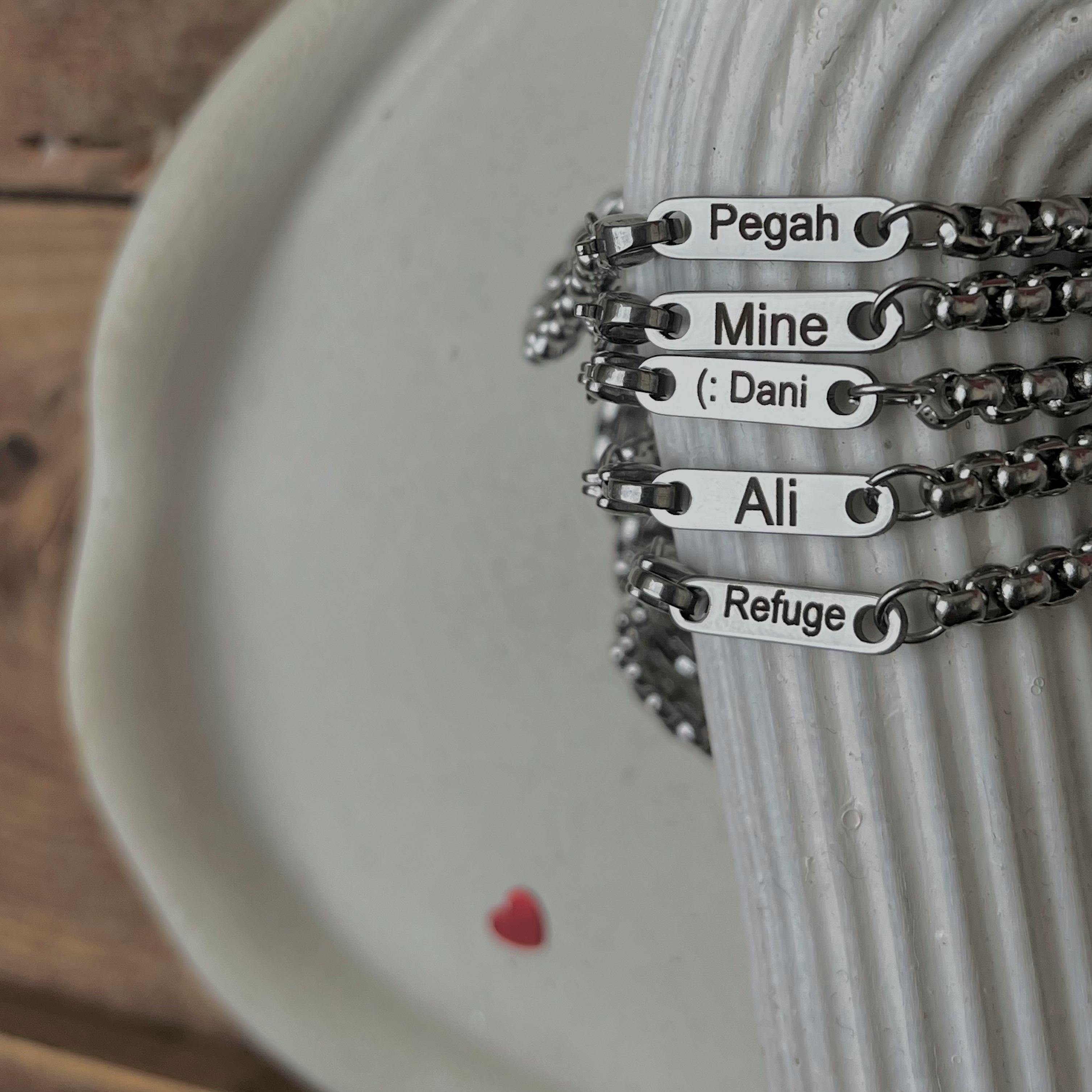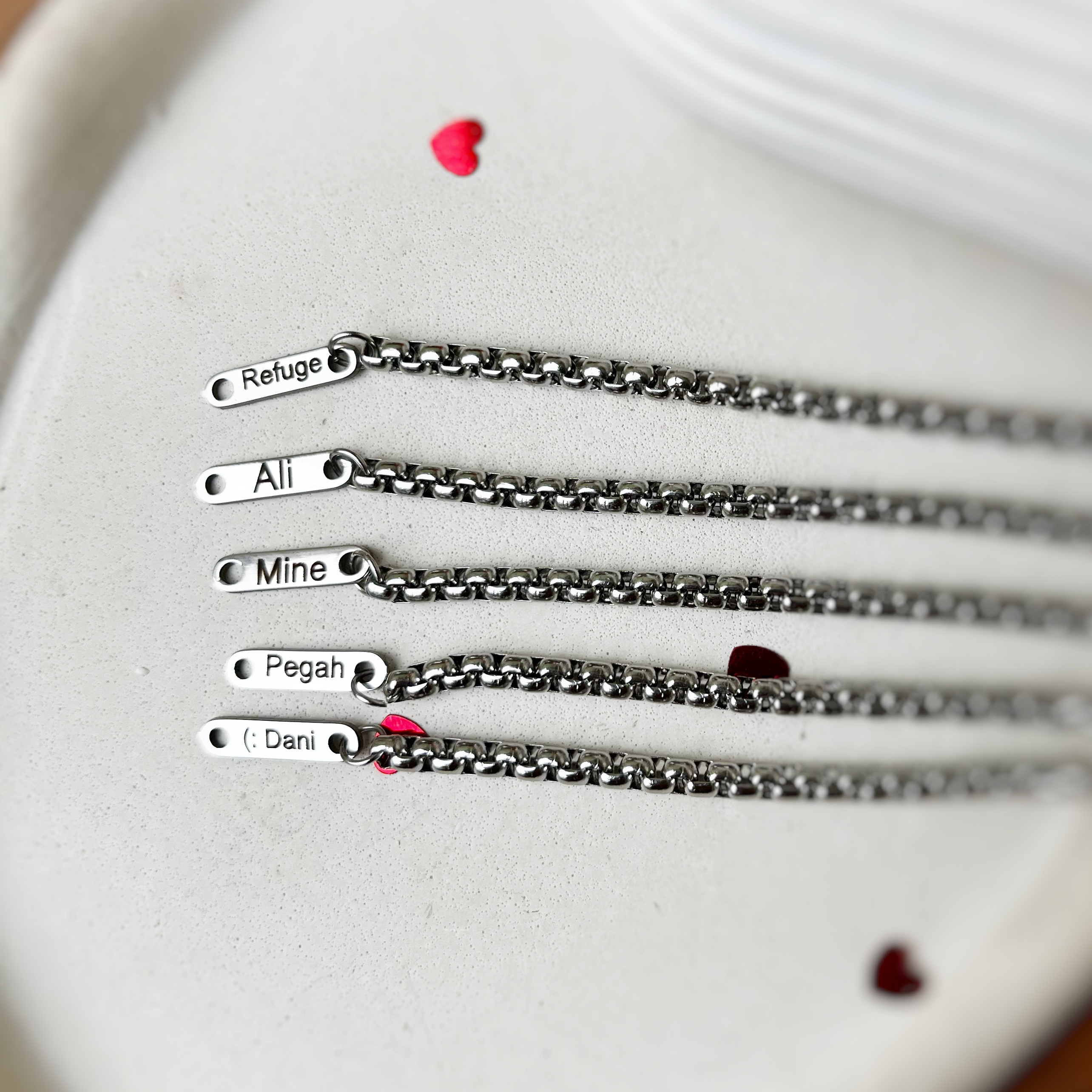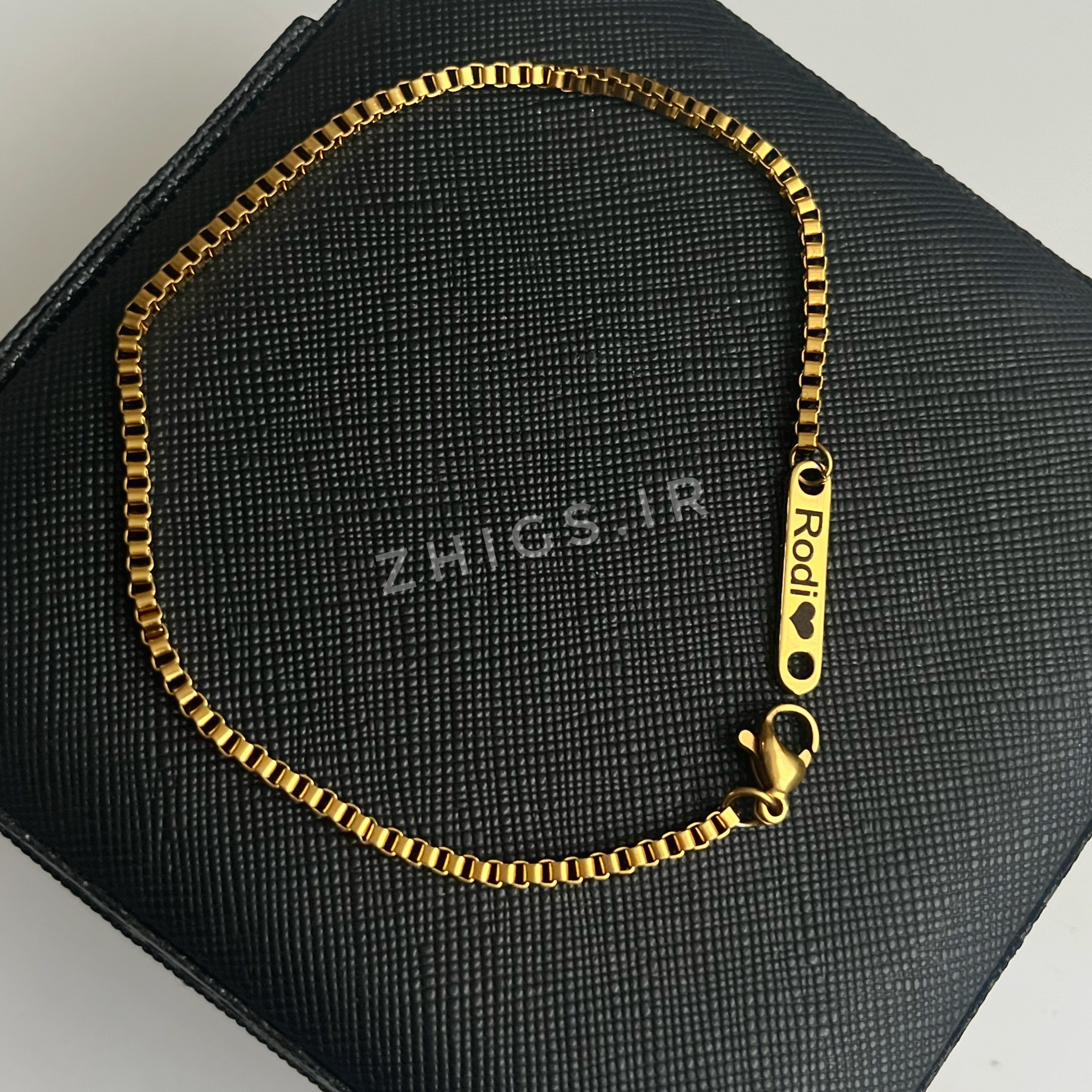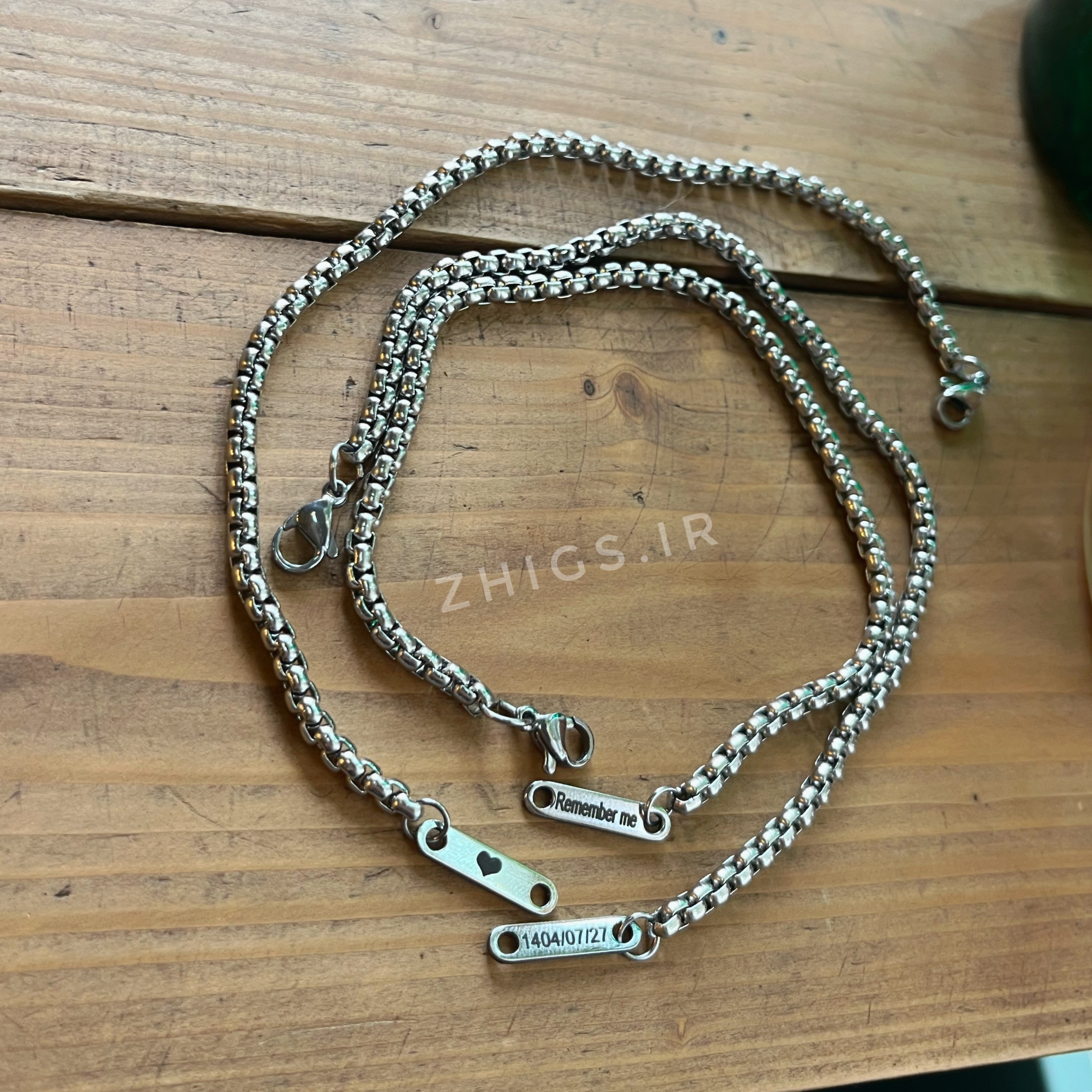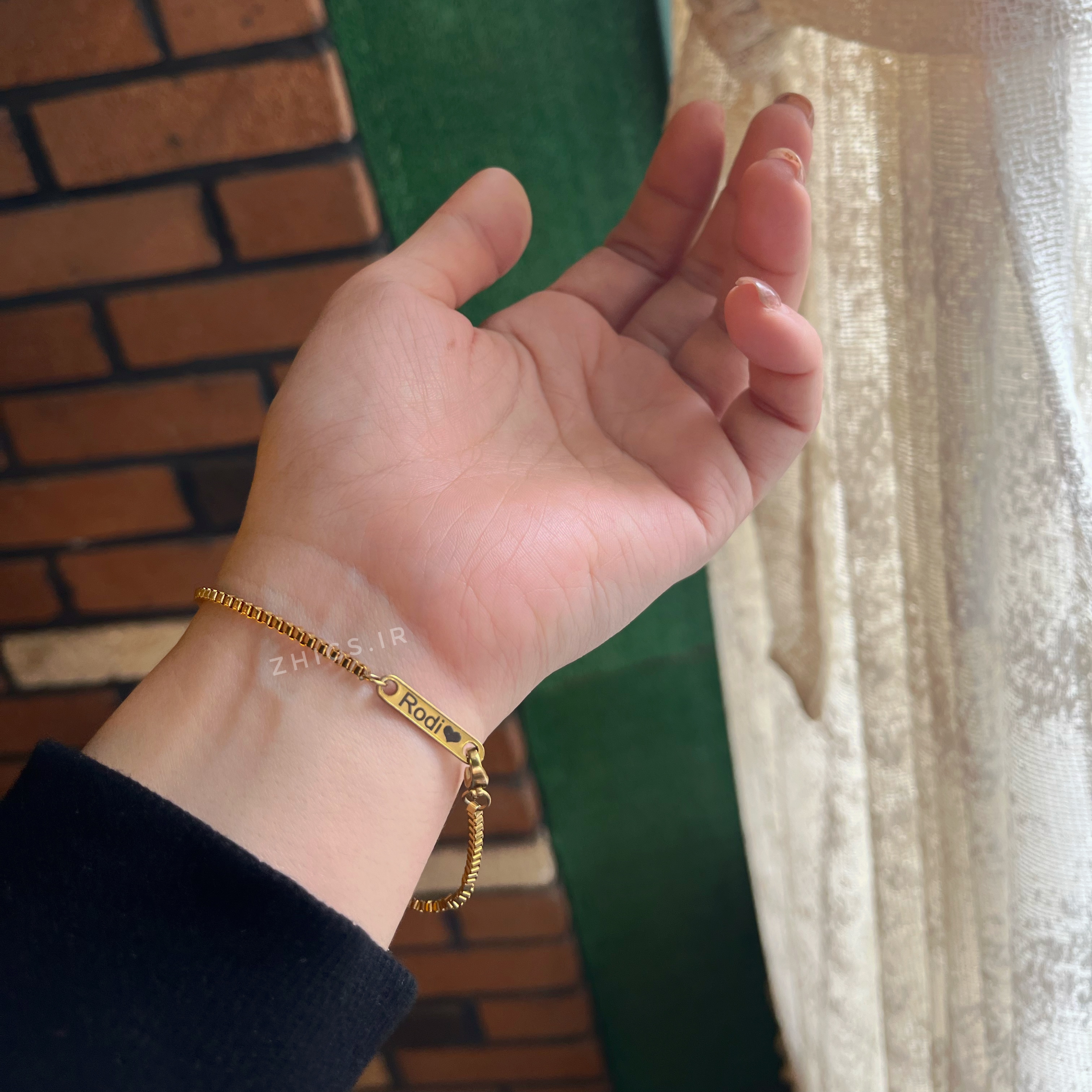 - پلاک مستطیلی فوقظریف : فقط یه پلاک کوچیک نقرهای/طلایی که اسمت روش حک شده – نه بزرگ، نه کوچیک، دقیقاً اندازهای که زیر آستین هم قشنگ میمونه.