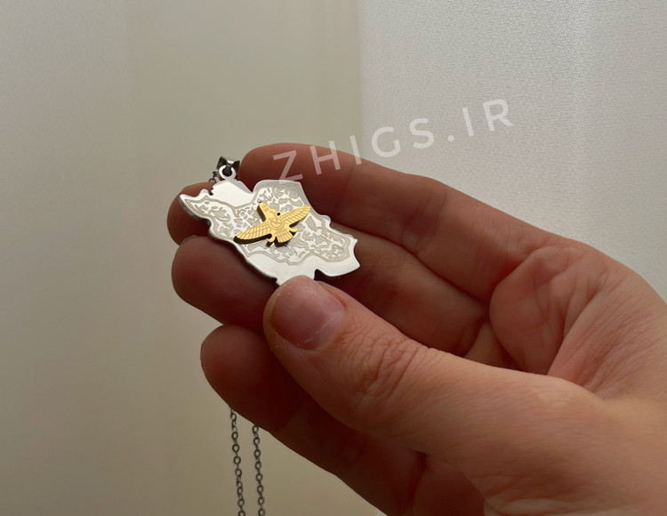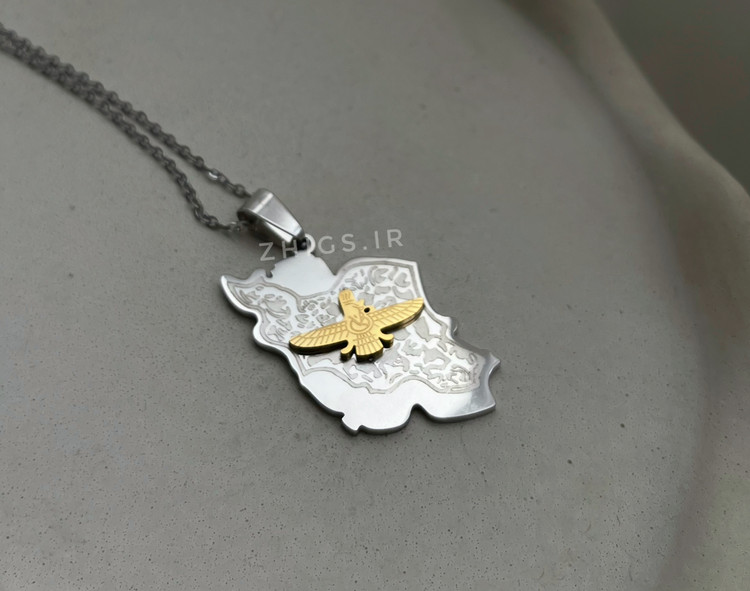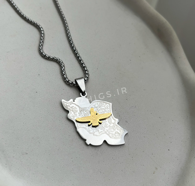 گردنبند استیل نقشه ایران با طرح فروهر، انتخابی خاص برای کسایی که به هویت و نمادهای ایرانی علاقه دارن.
