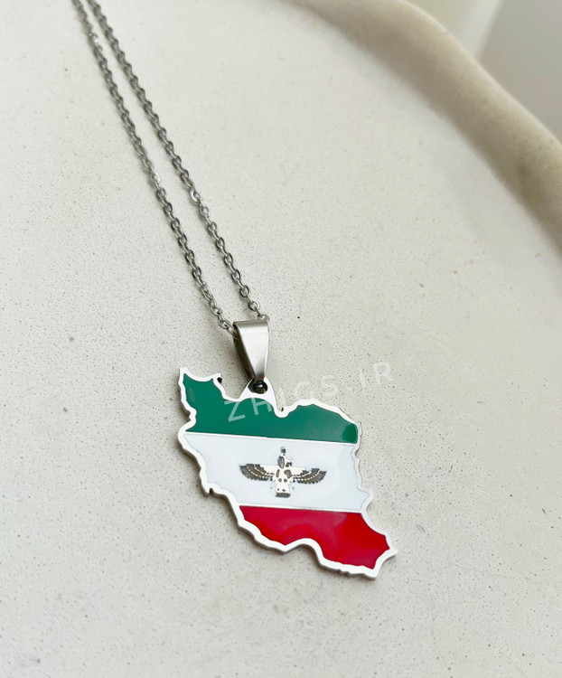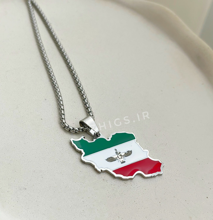 گردنبند استیل نقشه ایران با رنگ پرچم و نماد فروهر، انتخابی خاص برای علاقهمندان به نمادهای اصیل ایرانی.