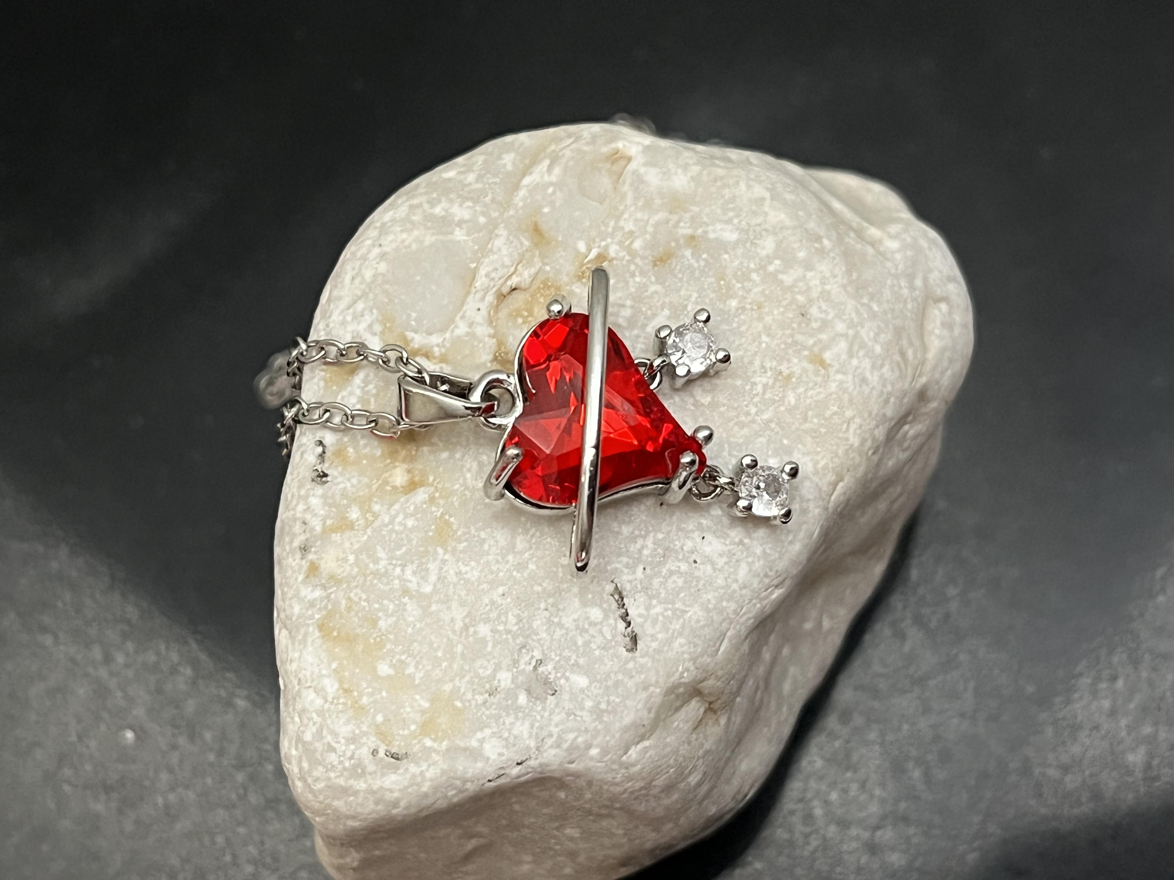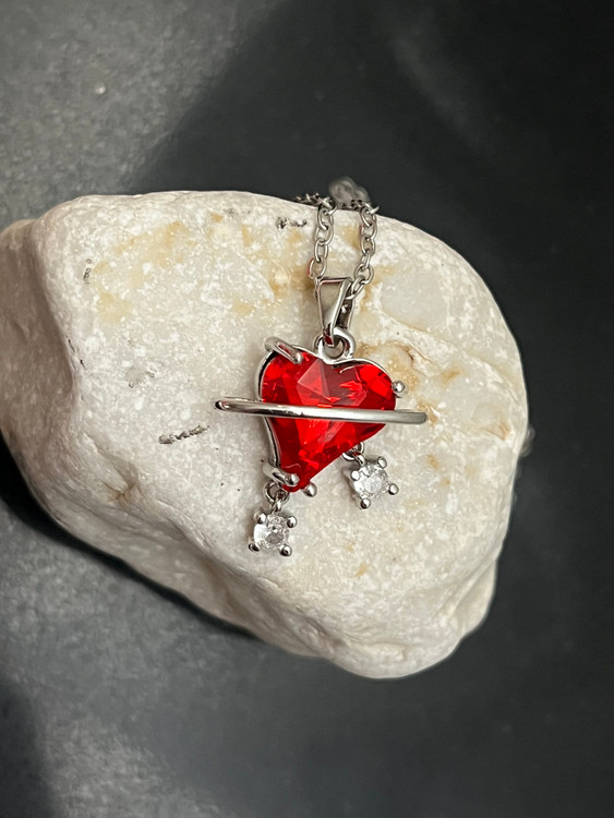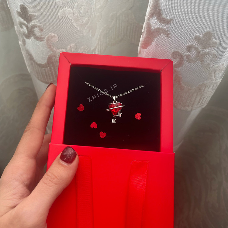 💎 قلب اصلی با نگین قرمز جذاب و دو اویز کوچک با نگین سفید براقی