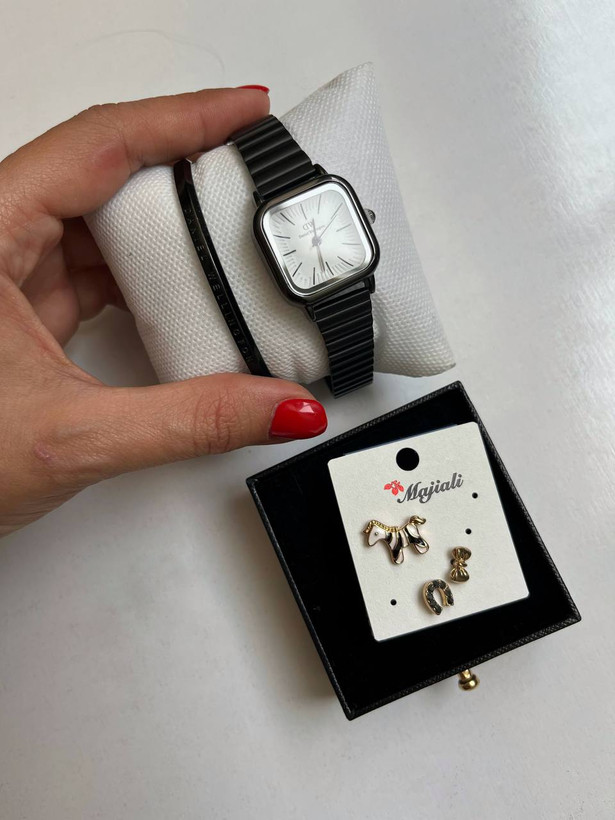 پک هدیه سیاه و سفید-ساعت و بنگل و گوشواره